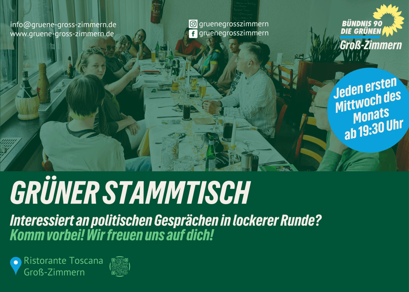 der Stammtisch unseres Ortverbandes Bündnis ’90/Die Grünen in Groß-Zimmern trifft sich regelmäßig, und wir freuen uns, Euch am 06.05.2026 um 19:30 Uhr im Ristorante Toscana begrüßen zu dürfen!