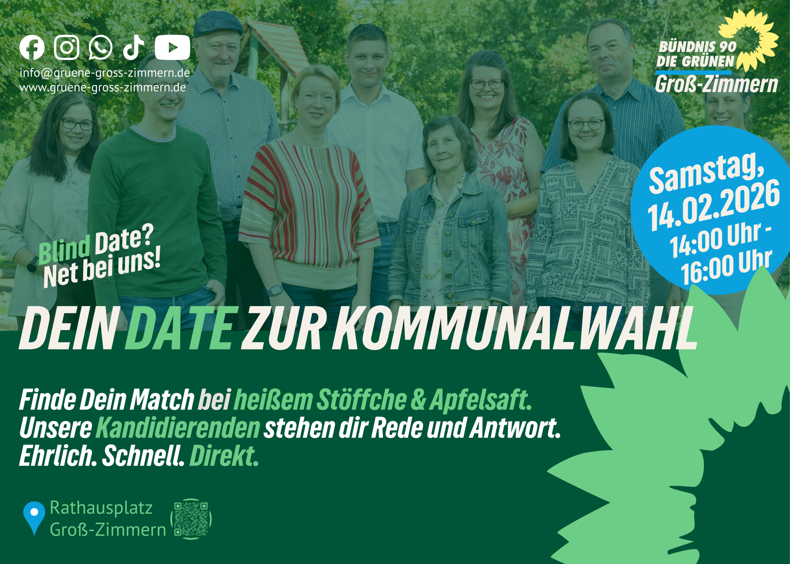 Du willst wissen, wer für die Grünen in Groß-Zimmern bei der Kommunalwahl antritt? Dann komm am Valentinstag vorbei und lerne unsere Kandidatinnen und Kandidaten im Speeddating kennen – ehrlich, schnell und ganz direkt. Und damit dabei nicht nur die Herzen warm werden, gibt es von uns für dich auch heißen Apfelsaft und Apfelwein.