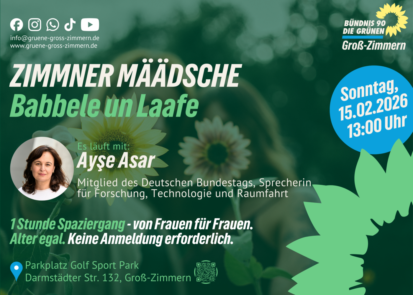 Wir treffen uns am Sonntag, 15. Februar 2026, um 13:00 am Parkplatz am Golf Sport Park und gehen zusammen etwa 1 bis 2 Stunden rund um Groß-Zimmern spazieren. Komm gerne auch schon 5 Minuten früher für Fragen und erste Gespräche.